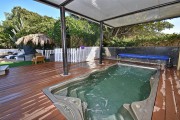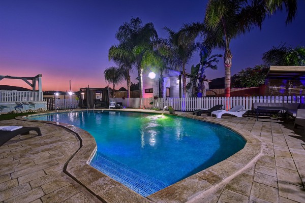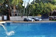 בחצר המתחם: מיטת שיזוף, שולחן סנוקר, ערסלים, ספסלים.